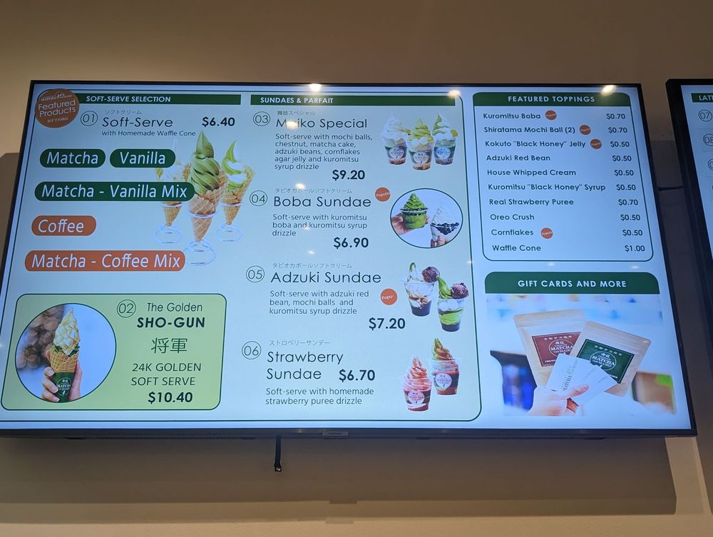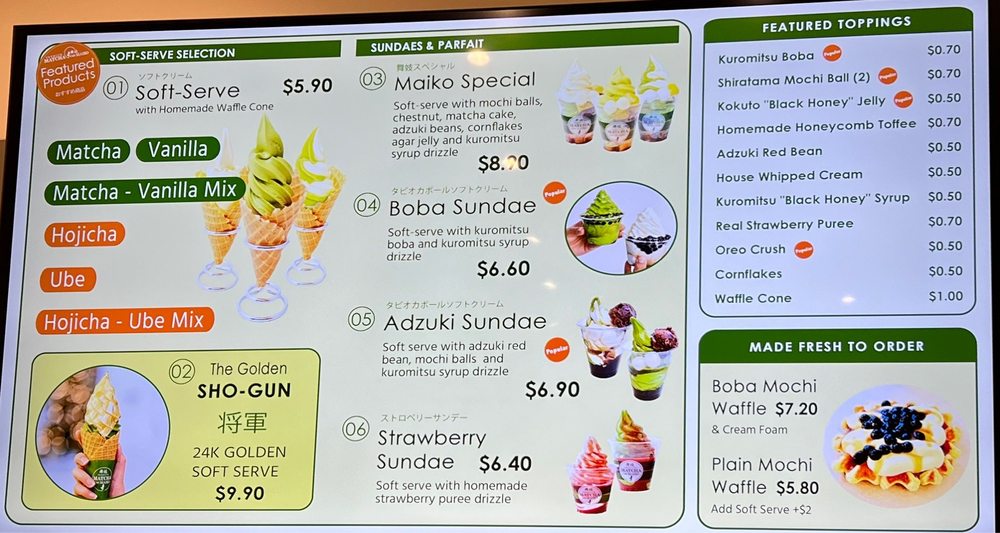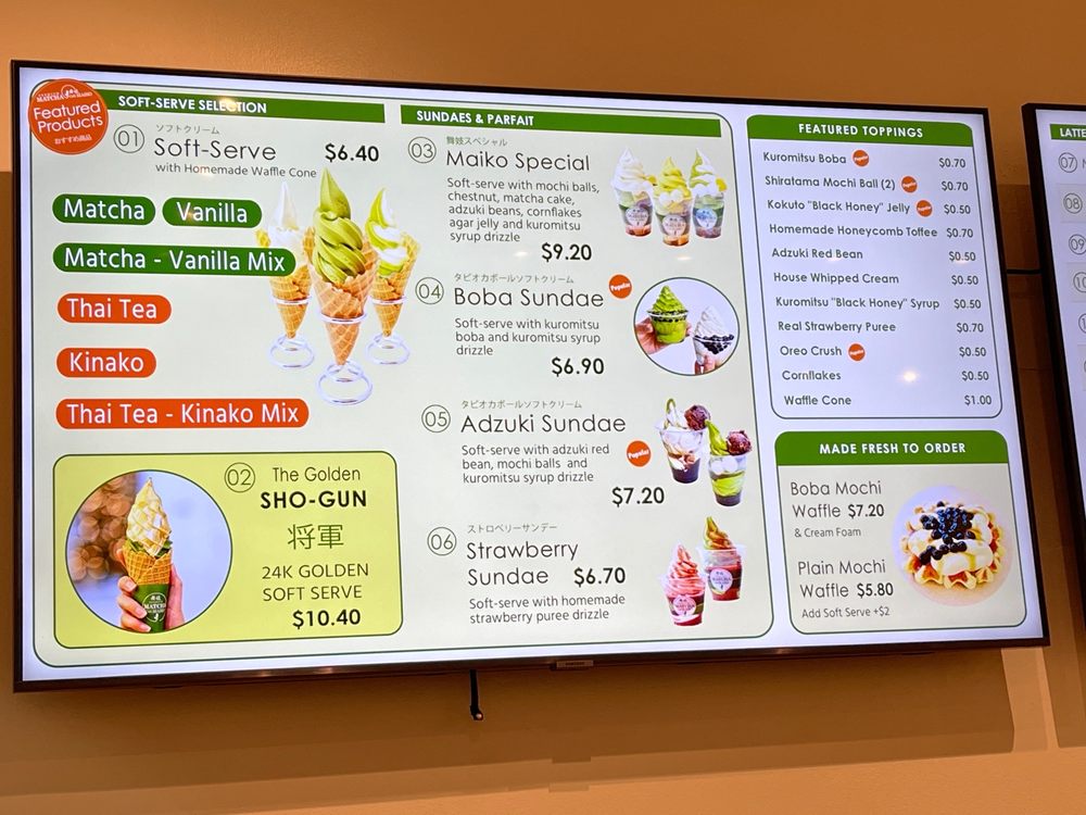 - Parfait Selection: The Maiko Special Parfait is a masterpiece, featuring layers of luscious toppings, including mochi balls and matcha chiffon cake, all crowned with your choice of soft serve for $8.90.